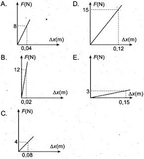 4. Di bawah ini disajikan grafik hubungan antara gaya (F) dan pertambahan panjang pegas (Δx). Pegas yang paling mudah meregang ditunjukkan oleh grafik